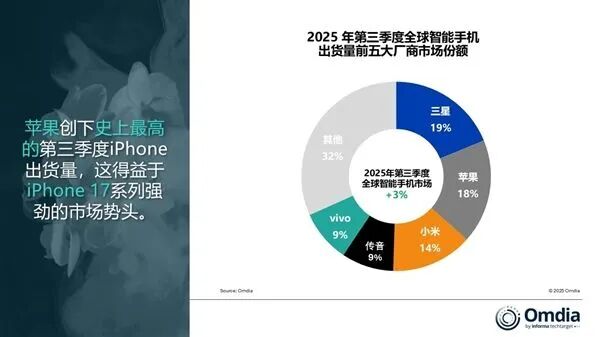 Counterpoint报告同样描绘出市场的乐观图景:2025年第三季度全球智能手机出货量同比增长4%。市场中,三星与苹果双雄领跑。三星在Galaxy A与高端S25系列的双重驱动下,以6%的同比增长拿下19%的市场份额;而苹果则以9%的同比增速成为前五强中的“增速之王”,其iPhone 17系列风靡全球,在多地区创下预售历史新高。