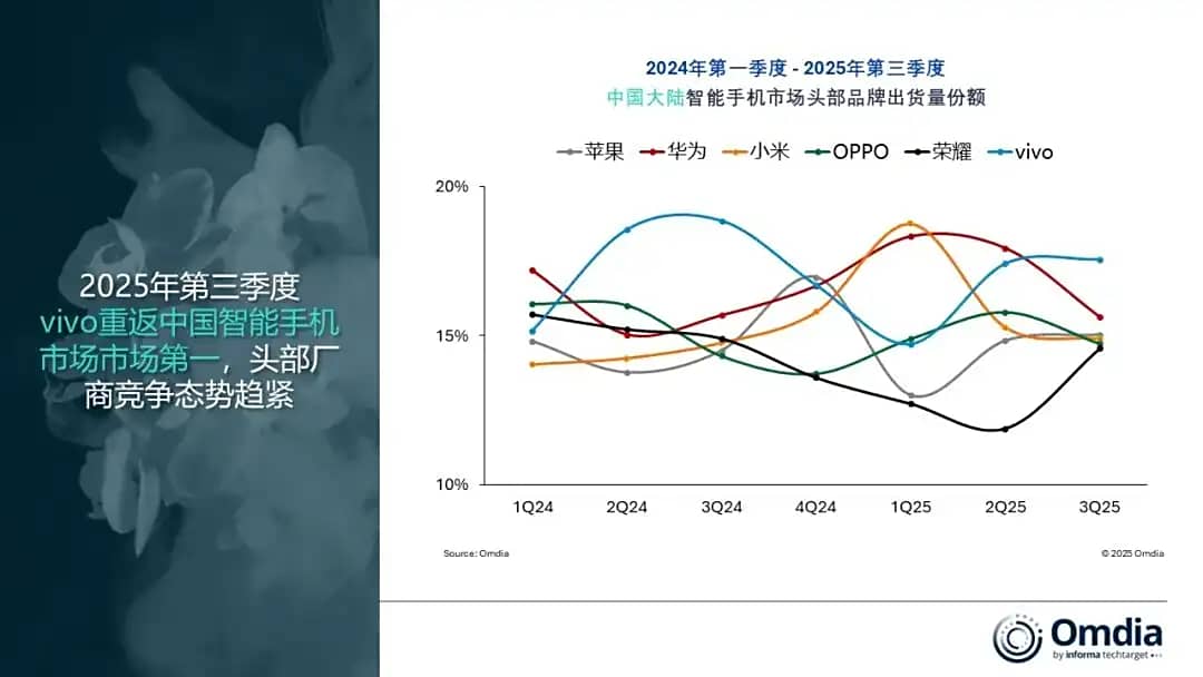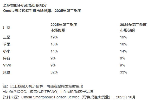 在Omdia的报告中,小米本季度表现稳定,市场份额为14%,位居全球第三。传音和vivo各占9%的市场份额,共同跻身本季度前五大厂商。