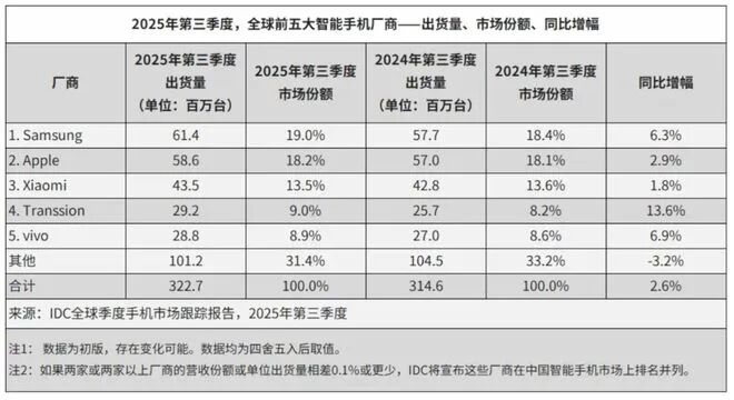 IDC最新数据同样印证了全球手机市场的回暖:2025年第三季度总出货量达3.227亿台,同比增长2.6%。