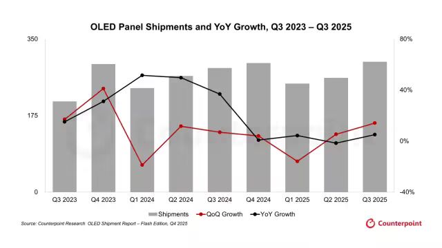 近日消息,市场调查机构 CounterPoint Research 昨日(12 月 8 日)发布博文,报告称受智能手机季节性需求强劲、显示器市场爆发推动,2025 年第 3 季度全球 OLED 面板出货量环比增长 14%,同比增长 5%。