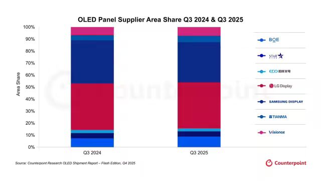 LG Display(LGD)凭借 iPhone 17 Pro 系列面板的庞大订单,智能手机面板出货量环比激增 59%,同时其智能手表面板也实现了 121% 的环比暴增,让其以 38% 的面积份额稳居行业第一(和第 2 季度持平)。