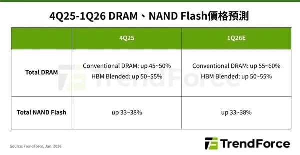 以下为2026年第一季度DRAM内存、NAND闪存价格预测: