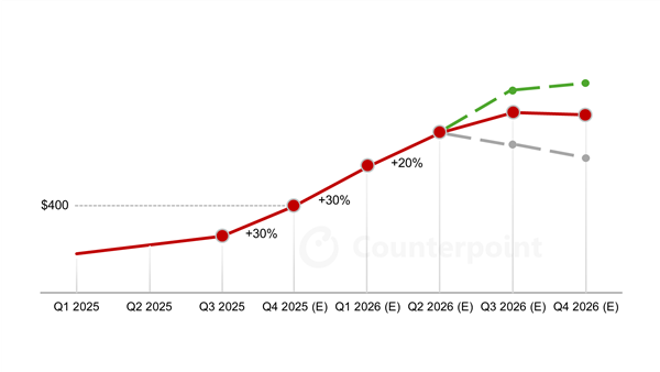 根据Counterpoint的报告显示,2025年第四季度内存价格预计上涨30%,此前年初已有50%的价格上涨,2026年初还可能上涨20%。