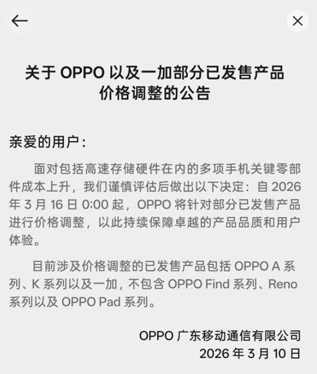 近日上午,OPPO正式发布公告,宣布从3月16日开始,对部分已经发售的机型进行调价,涉及A系列、K系列以及一加产品,Find系列、Reno系列和OPPO平板则不在涨价范围内。